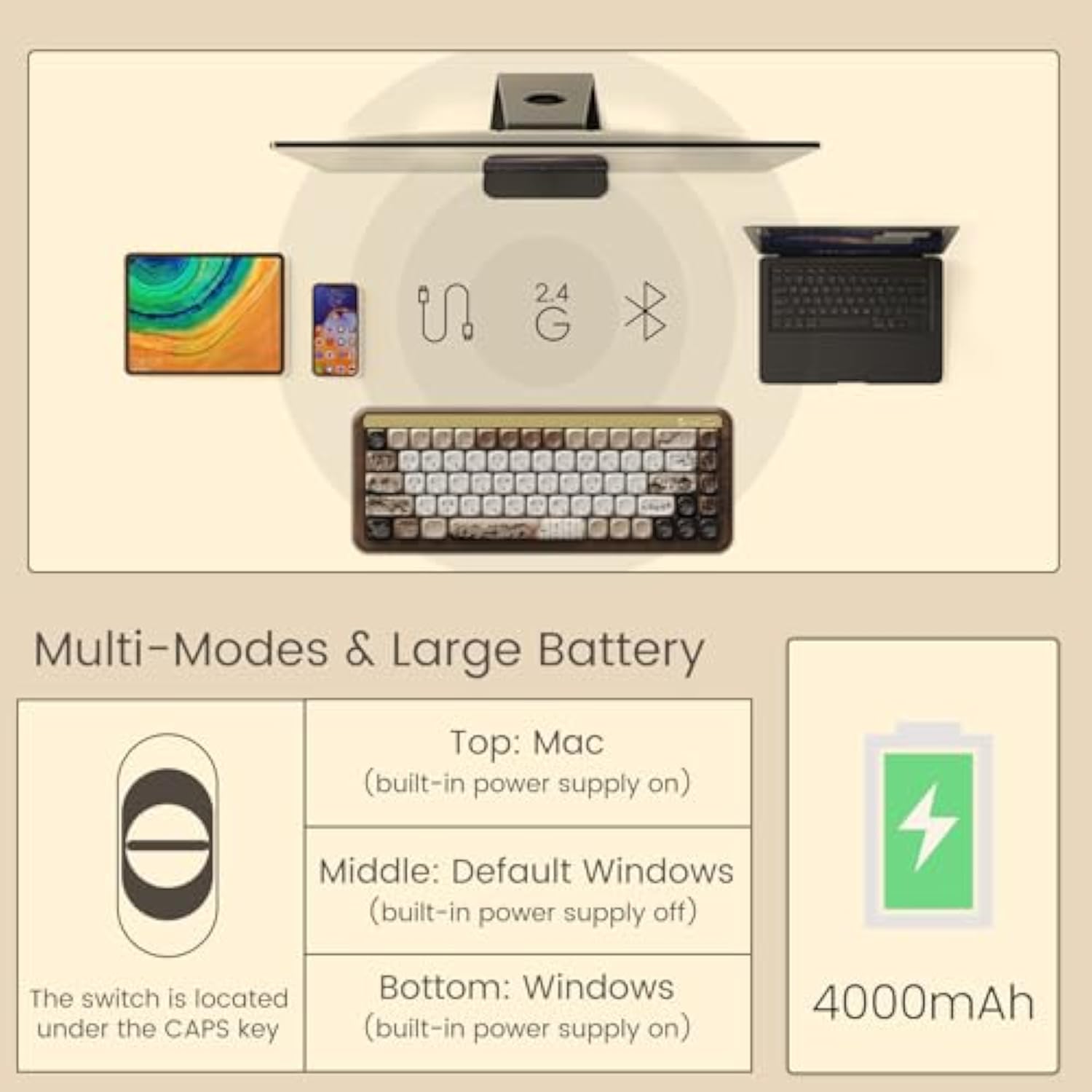 - WIRELESS & MULTI-DEVICE – Akko MU01 walnut wooden gaming keyboard is capable of switching between 2.4Ghz, BT 5.0 and USB-C wired connection mode for multi-device users. It is aimed for maintaining consistent and stable connectivity with a large 4000mAh battery.